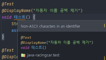 → 테스트 메서드 명을 그냥 한글로 해도 되지 않나? 싶지만 아래 이미지와 같이 caution이 뜨기 때문에, DisplayName을 사용하는 것이 좋다.