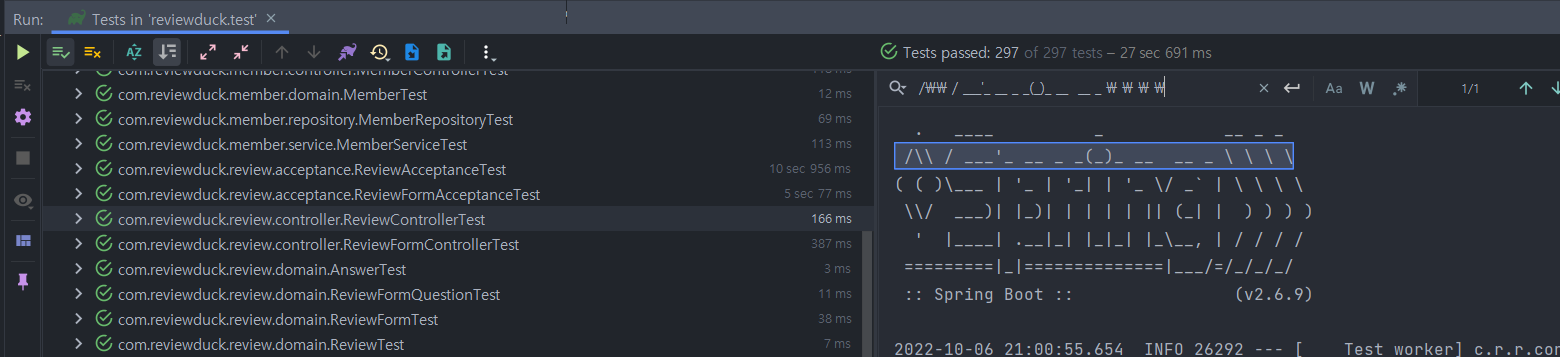 과거 코드의 경우에는 테스트코드가 굉장히 적어서, 현재 회고덕 코드에 DirtiesContext를 켜고 테스트를 해본 결과 각 AcceptanceTest의 개수만큼 context가 만들어진 것을 볼 수 있다. (acceptancetest의 메서드 21개 → 21개가 만들어졌다. )