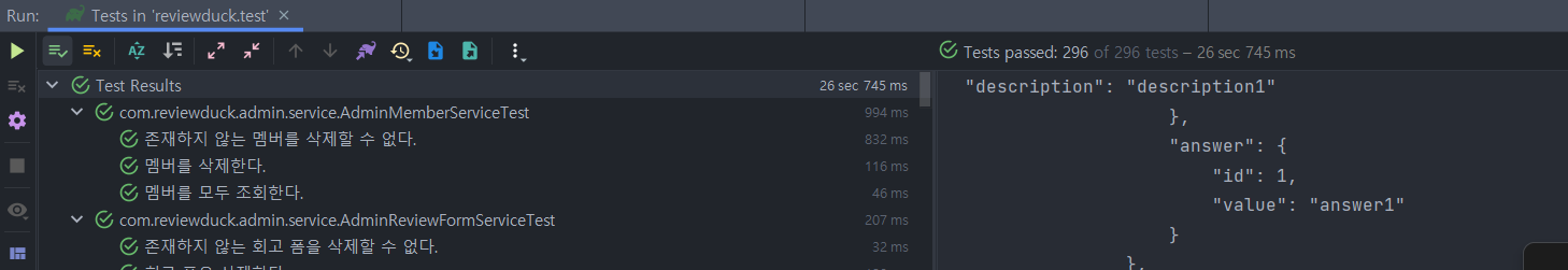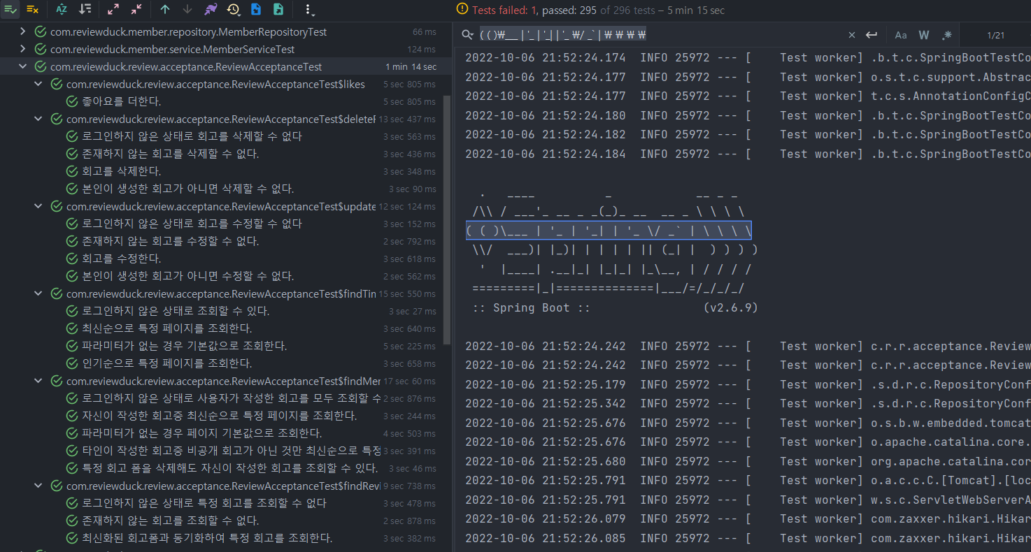 결과적으로 테스트 코드 296개를 실행하는데 실행 시간만 5분 15초, 이를 위해서 준비하는 시간까지 포함하자면 10분 이상의 시간이 들게 된다.