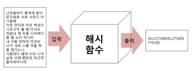 - 임의의 크기를 가진 데이터(Key)를 고정된 크기의 데이터(Value)로 변화시켜 저장하는 것
