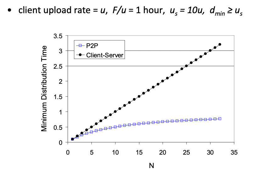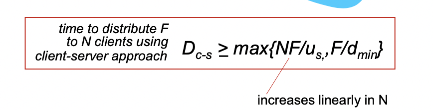 -> 클라이언트들이 동시에 다운받으려 할 때 가장 다운 속도가 느린 곳에서 bottleneck이 발생하기 때문에 다운로드 속도가 가장 느린 곳이 전체 속도를 결정한다. : F/dmin - 전체시간