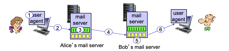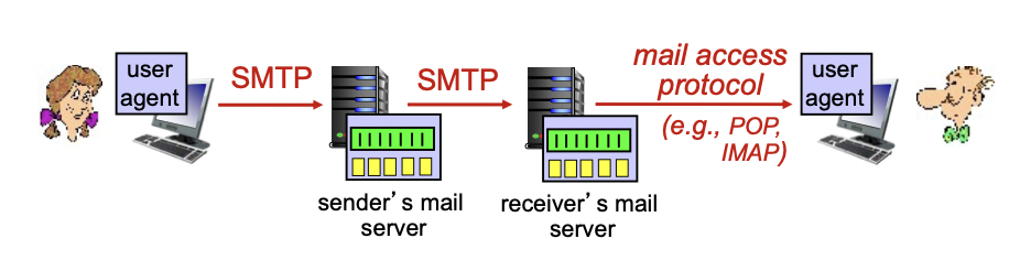 - Mail servers(메일을 가지고 있는 서버, SMTP로 메시지 주고받음.)