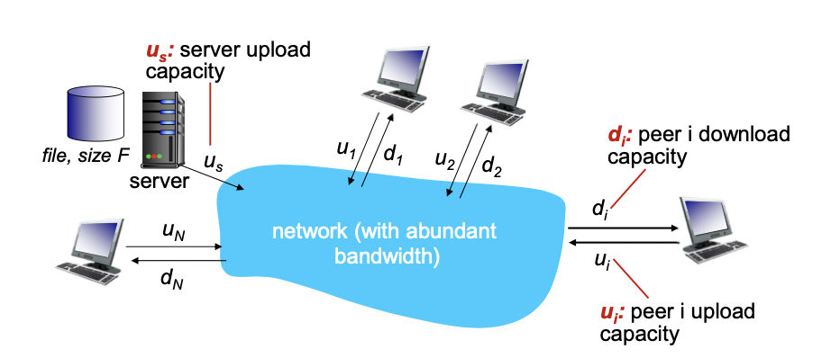 F 사이즈의 파일을 한 서버로 부터 N개의 peer들에게 distribute 하는데 얼마나 시간이 걸릴까?